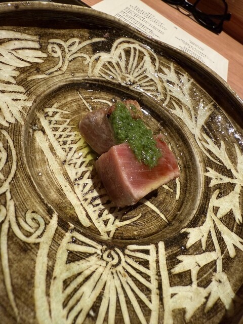 今年の初セリで2番手の高値を付けたという、最高品質の「大間産本マグロ」。舌の上でとろける脂の甘みを、キャビアの塩気がキリリと引き締めます。これ以上ない贅沢なスタートです。