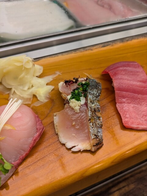 牛肉と見まがう程、薄〜いピンク色の中トロ(と思われる)脂か乗って、“何じゃこりゃ〜”と唸る美味しさ。