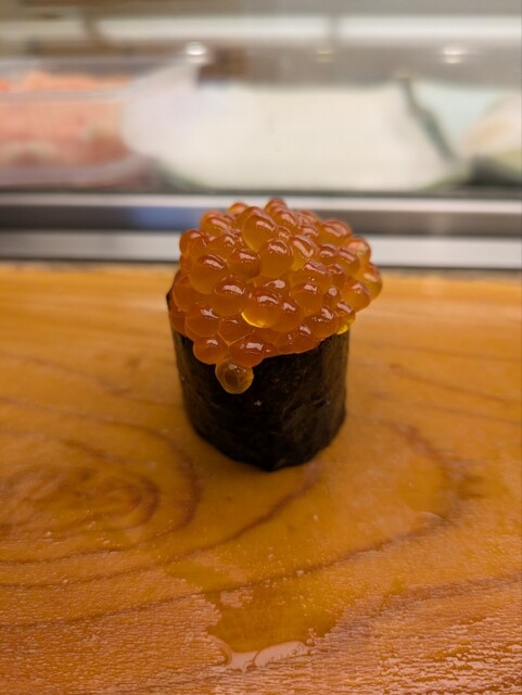 ラスボス来ました!これでもかという位イクラが乗ってこぼれそうです。軍艦巻の海苔も香ばしく量美味しい。