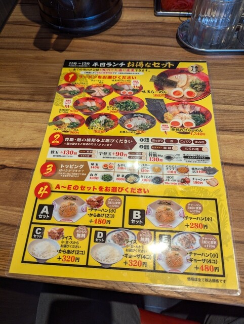 味玉ラーメンのCセット(白ご飯と唐揚げ2個)を注文。背脂の量は並、麺は細麺にしました。サービスで高菜をだしてくれます。