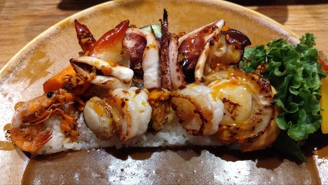 具材はソテーされた海老、ほたて、イカ、タコ、北寄の魚介と、素揚げされたブロッコリー、れんこん、にんじん、ズッキーニ、パプリカの野菜たち&海老。