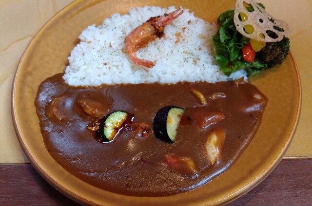具材は、ルーの中に海老、ほたて、イカ、タコ、北寄の魚介と、にんじん、ズッキーニの野菜。