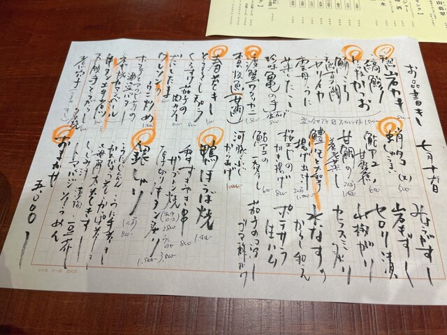 原稿用紙にシンプルに筆ペンで書かれているメニュー表。これも素敵だなぁ。端から全て頼みたいが、おすすめマークが付いているものを中心に注文。