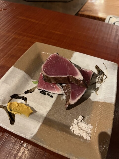 ・刺し盛り…カツオの藁焼きも後から出てくる。目の前で藁焼きを鑑賞。藁焼きの効果か、虹色に輝いている。分厚いカツオで独特の香ばしい香りが口いっぱいに広がる。市場で卸業もしているようで、刺身は保証された味。