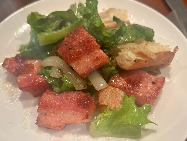 サラダや、カリカリチキン、ステーキ、最後はボロネーゼスパゲッティと腹パンになります。ずっと飽きない最高の味。