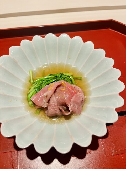 湯葉が乗っており、しぐれ煮のような和風の味で筍の炊き込みご飯ととても良く合いました。