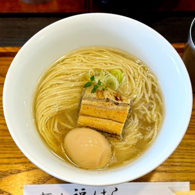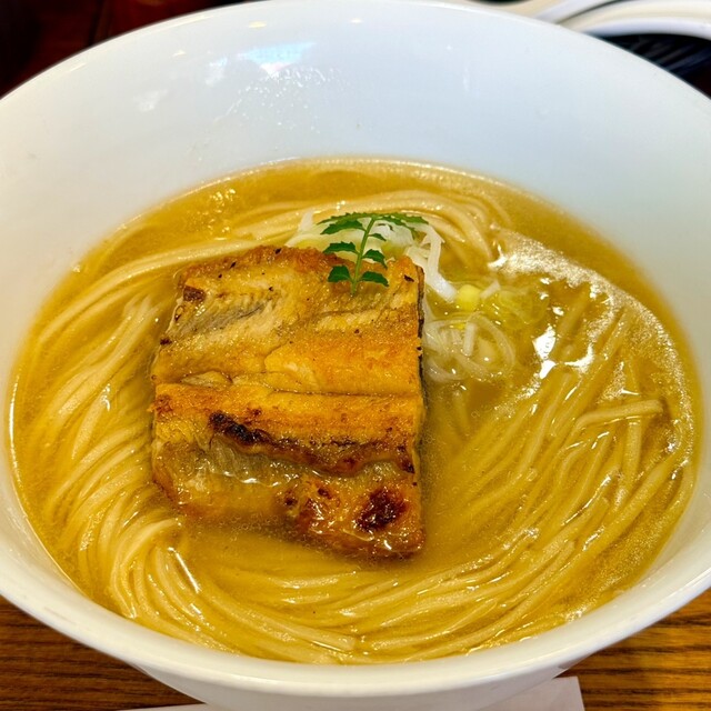 まずはスープを一口。鰻から引いた出汁はクセを抑えつつも、しっかりとした旨味を感じさせる上品な味わい。塩清湯のような透明感がありながら、深いコクが広がる。そこに木の芽の爽やかな香りが重なり、和の趣を感じさせる。麺は中ストレート麺で、つるりとした喉越しとしなやかなコシが絶妙。スープをしっかりまといながらも、存在感をしっかりと残している。トッピングの鰻の白焼きは、提供直前に炙られたことで香ばしさが際立ち、ふっくら肉厚な食感がたまらない。鰻の風味を存分に味わえる、まさに"鰻まみれ"の一杯。他ではなかなか出会えない貴重なラーメン!
