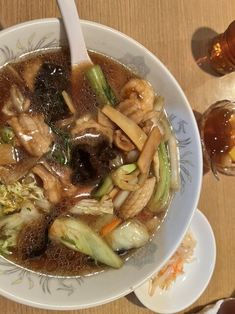 中華メンは、今まで食べてきた広東麺でした。海老やイカなども入ってて、これがまたまた美味しい。
