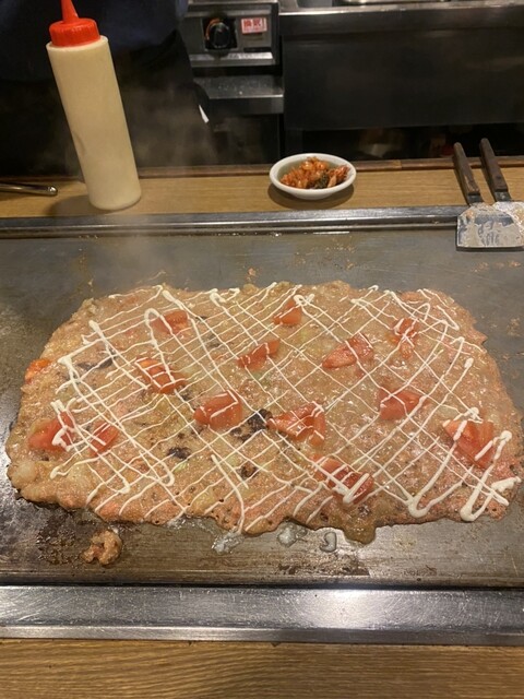 ふくさ屋の明太子が使われており、他にもじゃがいもやトマトなど具材盛りだくさんで美味しかったです。キムチを別皿に付けてくれるので、お口直しによかったです。