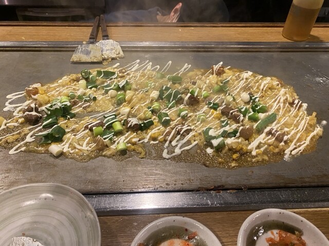 牛すじもんじゃも味がしっかりしていて、明太子とまた違った味付けで楽しめました。こちらはキムチと高菜を別皿で付けてくださいました。
