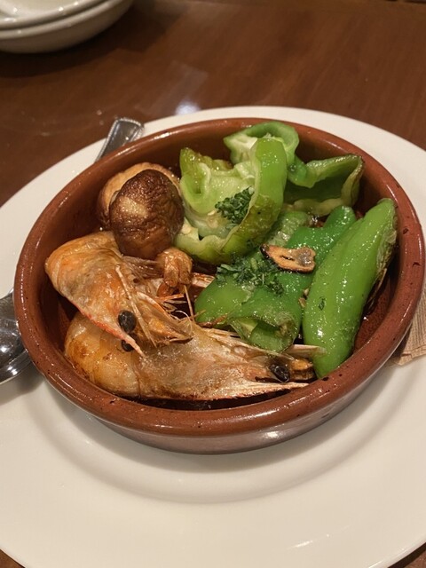 ・天使のエビと青唐辛子のアヒージョ→エビの頭付き、殻まで食べられる薄皮!