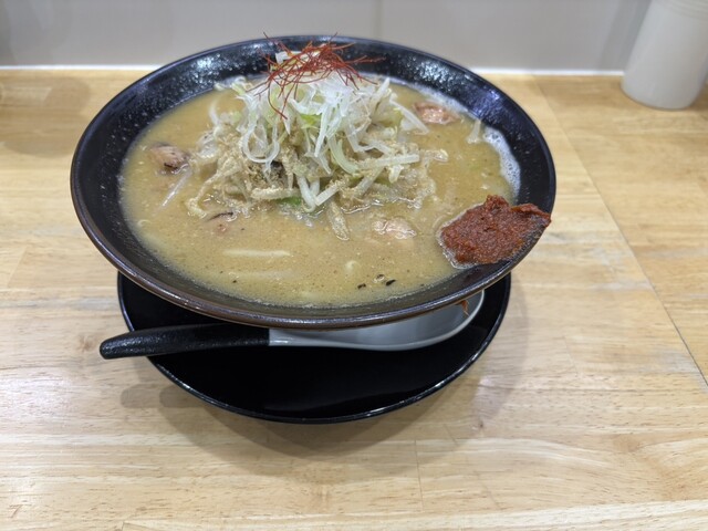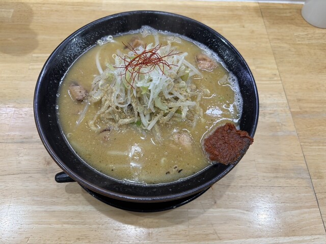 宮城出張、空港への帰路のカーラジオでたまたま宮城の人気ラーメン屋さんアンケートで県南ナンバー1が空港チカだったため、フライトまで時間あり平日夕方に来店。17時過ぎだが駐車場はかなり埋まったが並ばず着席。以前の来店時にもラインナップに悩んだが、今回は辛味噌を注文。連れへオススメした立場だが、やはり県南随一の評判は伊達じゃない、スープのコクは人生でトップクラス。