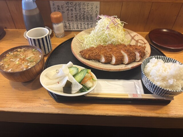 土曜日の11時開店前に到着したかと思いきや、既に三人並び、さらに80歳のご夫婦がご近所に迷惑かけてはいけないと早めに営業開始してたので、満席、一巡目が終わった11:10頃に入店。ロースかつ定食を注文。お歳に見えないご夫婦の気配りが心地よく、お茶、お冷、キャベツ、ごはんのおかわりを促してくださり、程なくお料理到着。お新香もキレイに盛り付けられ、カブの千枚漬け、きゅうりと白菜の浅漬けはシャキシャキ、なみなみ盛られたなめこのお味噌汁が素朴で沁み入る、ロースかつは衣サクサクのお肉柔らかジュワーの典型的な美味しいとんかつ。主役はとんかつだが、主役級が目白押し。午前中から大満足、基本は11時開店だろうが早めに到着することを推奨。普通のロースかつで十分美味しかったが、時間が限られおかわりもほとんどできなかったので、次回はゆったり上ロース、上ヒレをいただきたい。