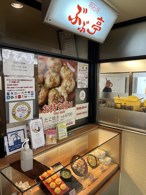 夕方ごろに軽食目的で伺いました。明石焼き、たこ焼き、たこ焼きグラタンの3種類を注文しました。どれもお出汁が効いている美味しいたこ焼きでした。明石焼きは1番人気であっさりのお出汁が絶品です。日曜日だったので数人が待っている状況です。