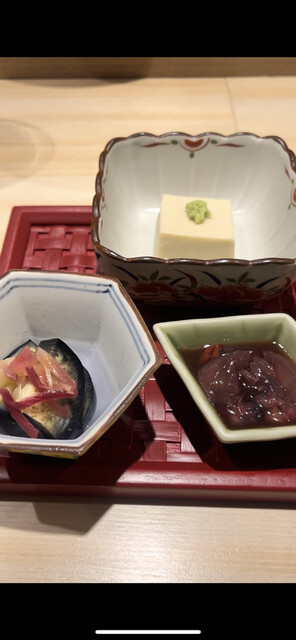 まずは小鉢3種で静かに幕が上がる。滑らかな舌触りの自家製ゴマ豆腐は、ほのかな甘みと香ばしさが共演する序章。ホタルイカの沖漬けは、深海を思わせるような濃密な旨味が舌を包み、水茄子の浅漬けは瑞々しさの極み。塩気と青さのバランスが絶妙で、まるで一服の清涼剤。小さな器の中に、季節と技がしっかり息づいている。