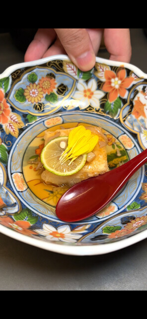 湯気の奥から立ちのぼるのは、三種のきのこの芳香。舞茸の香ばしさ、松茸の品格、えのきのやわらかな旨味が、自家製餡のとろみに溶け合う。揚げ豆腐の衣は軽く、箸を入れれば中はふわり。秋の森をそのまま器に閉じ込めたような一皿で、滋味深くも上品な余韻が静かに広がる