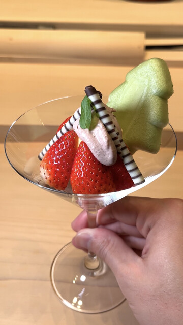 苺のババロアがふくよかな甘みで迎え入れ、上に重なる自家製バニラが静かに輪郭を整える。ツリーを模した淡い緑の最中は軽やかな食感で全体を弾ませる仕掛けだ。