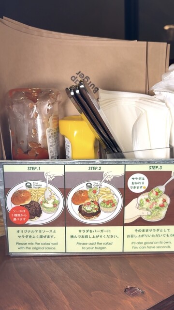 バンズは肉の圧に屈せず、全体をまとめ上げる冷静な役回りだ。ここにサラダを挟み込むと、景色が変わる。シャキッとした葉の食感と瑞々しさが、肉の熱量に鮮やかなコントラストを与え、噛むごとに輪郭が研ぎ澄まされていく。おかわり自由という選択肢は、満腹のためではなく、味の組み立てを遊ばせるためにあるのだろう。