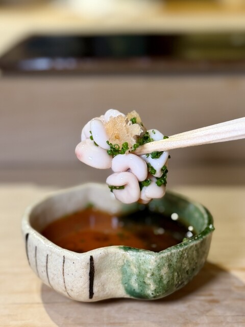 アオリイカは包丁目が美しく、しなやかな食感。鯵は鹿児島産を塩と醤油で締めており、身はしっとりと旨み濃厚。