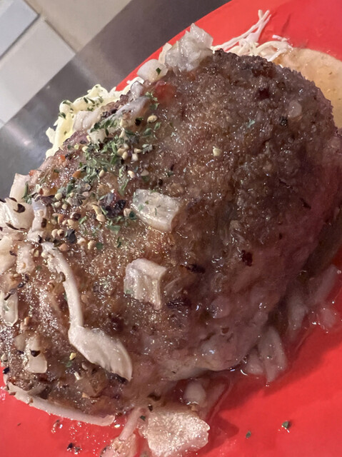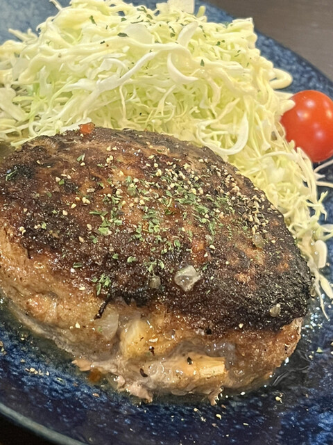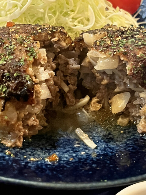 オーダーが入ってからブロックの生肉を手際よく切り分けハンバーグの味付けをして次は焼くのかと思わせてそのままテーブルにドンっ( ;∀;)