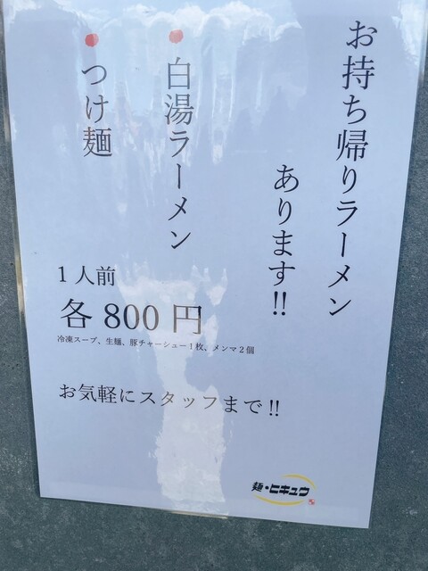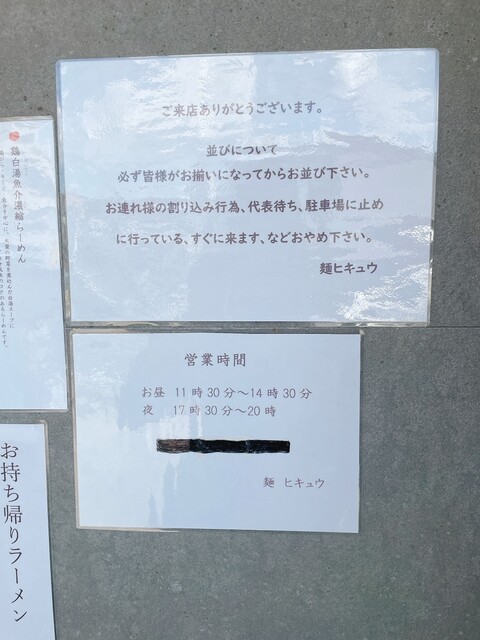 午後1時10分頃、「麺・ヒキュウ」の前を通ると、お店の前にお客さんが1人だけ並んでいた。お昼時を少し過ぎていたからかな、人気店なのにこれはラッキーと思い並ぶことにした。