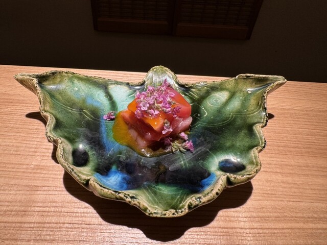 軽く漬けにしたメジマグロはもったりとまろやかで、魚の繊維をまったく感じさせないほどの柔らかさでした。卵黄のソースも濃厚で、すべてがとろけるように調和しており、最高に美味しかったです。
