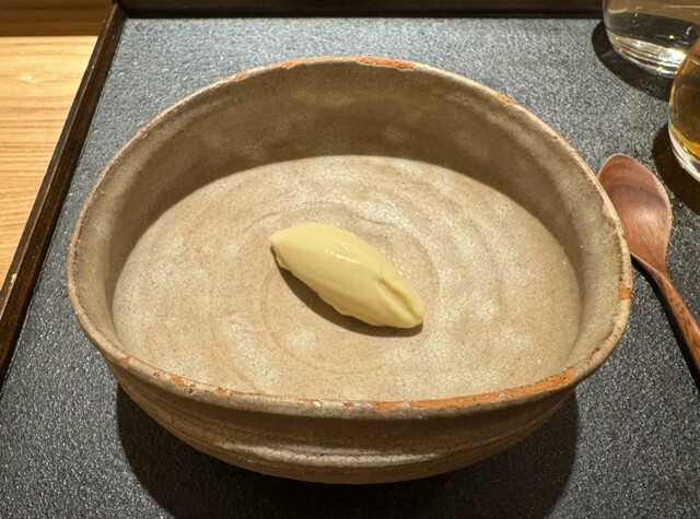 前回びっくりしたこちらのお口直し。今回は前回と別の方と伺ったのですが、とてもいいリアクションをしていました。本当に焼きなすをそのまま感じさせてくれるアイスクリームです。今回発見したのですが、これだけで日本酒のおつまみとしても最高でした。