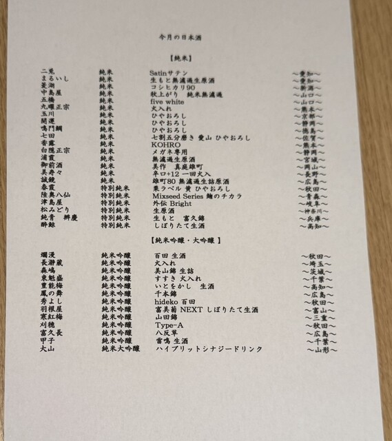 また、ドリンクにとてもこだわっており、特に日本酒とワインの品ぞろえはすごかったです。日本酒にはそれなりに詳しいのですが、見たこともないような日本酒が非常に多く、お酒だけでもまた伺いたくなるほどでした。季節が変わる頃に、また伺いたいお店です。