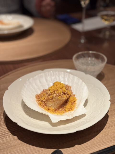 帆立の甘みと唐墨の塩気のバランスがよく、フライドエシャロットの香ばしさがプラスされて上品。