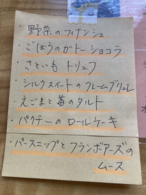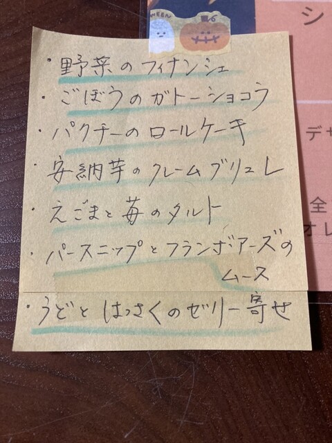 2500円。デザートの私のNo.1のさといもトリュフはお休み中。なんとNo.3のえごまタルトが売り切れとなっておりショックでしたが、新たなデザートを食するチャンスと思い気を取り直して注文。
