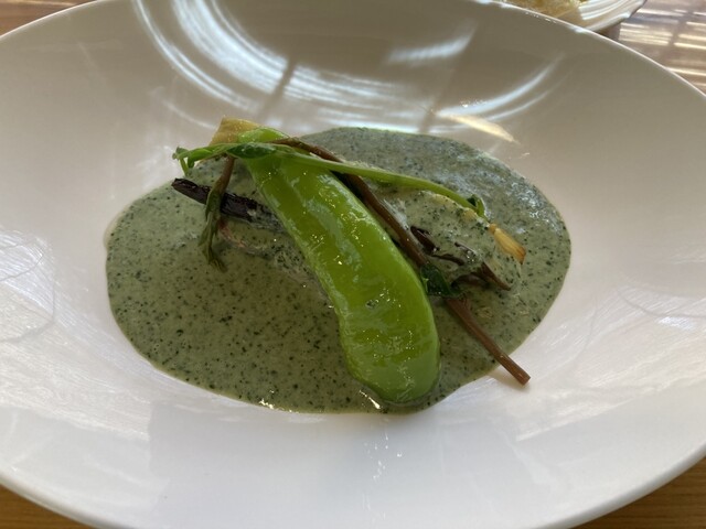 塩豚モロヘイヤのソース。驚き!モロヘイヤのソースなんて初です。まず色からすごい!ジャンボピーマンも相まって緑攻めでした!まず、ソース。おー美味しすぎるー!ねと、トロ、甘、まろやか、いや塩味もでもコクがすごい!不思議!何、何?!と考えながら食しました。楽しい時間でした!後からお聞きしたところ生クリームや醤油、わさび、出汁など主張しない程度に使われていました。また新しい発見で嬉しいです!