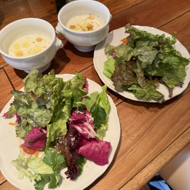 サラダとスープ、フォカッチャ、ドリンク、ミニデザート付き