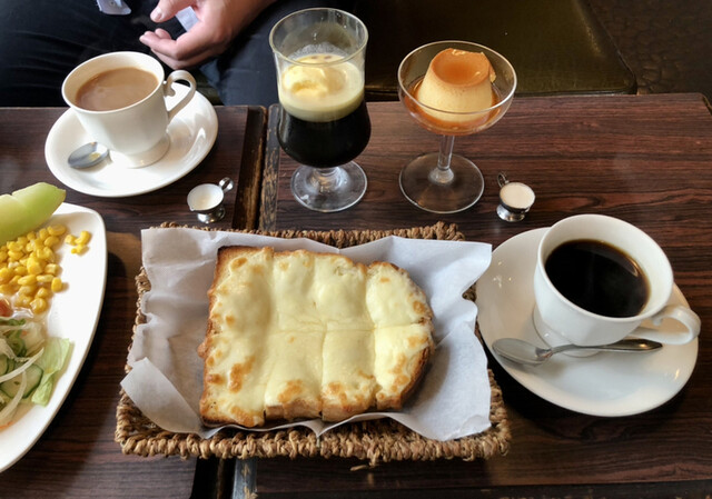 モーニングだけでも沢山のメニューで、皆さんの口コミで「サラダ」と書いてあるセットを頼むと、サラダのお皿にはメロンが付いている、と知っていたのですが、更に珈琲ゼリーとプリンが付いたセットがお目当て♪「チーズトーストセット820円」の写真が貼って有ったので、人気のそちらを注文。主人は「お一人で忙しそうだから簡単なモーニングにする。」と、サンドイッチと珈琲のモーニング600円を注文。