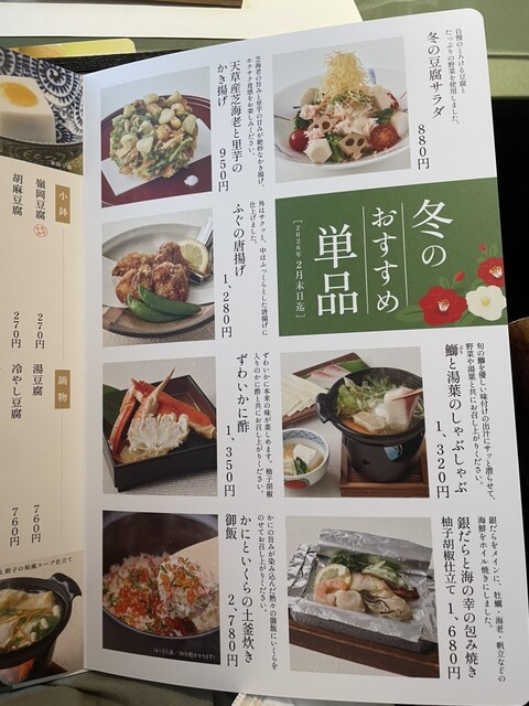 「湯葉豆腐と黒胡麻豆腐のお造り」と「湯豆腐とろろ昆布仕立て」は薄味で上品。