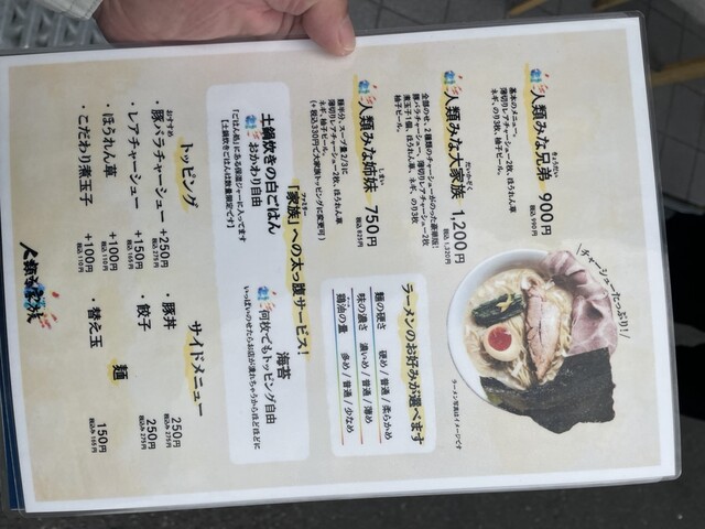 いつも見るだけで食べる気が失せる待ち客の列の長さで断念してましたお店。今日は外待ち2名のみ。すぐに入店できました。中はけっこう広いのですね。すごく愛想の良いお姉さんに案内されて着席し 人類みな兄弟(豚骨)をオーダーしました。こちらのお店は注文から提供まで少し時間掛かると言うのでその間にサービスの土鍋ご飯に海苔を取ってきて…ラーメンと共にいただきます。スープ、麺共に味がはっきりしてて非常に美味しい。チャーシューはレア気味で少し塩辛かった。海苔は麺と一緒に啜ってもちゃんと海苔の味を感じれて…全ての味がしっかりしてる印象です。ご飯もこれ私の持論ですがラーメン屋のご飯は固い目が良い、そのもののご飯でしばらく噛んどけそう。美味しかった。次回はマストの醤油食べたいです。