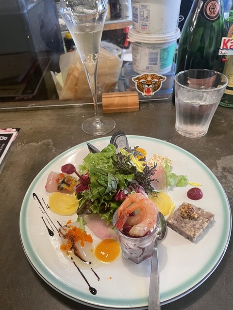 魚介類に、新鮮野菜、生ハム、煮凝り、シュー生地の中に包まれたパテ、ドライフルーツ入りクリームチーズオンバケット、バラエティに富んでおり、ビール、スパークリング、ワインなんでも合う最強の前菜!