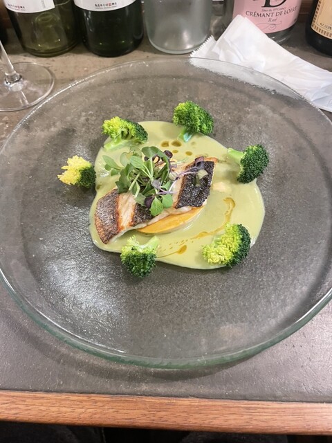 魚は、スズキのポワレ、ブロッコリーの貝風味のソースはとても濃厚であっさりとして皮がパリッとしたスズキのによく合います。