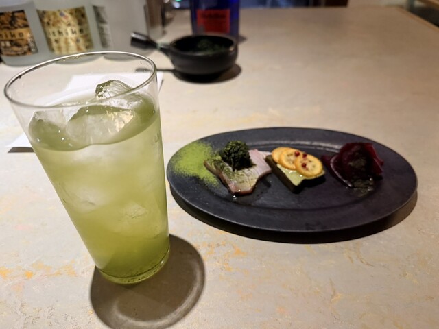 おつまみには、寒ぶり×ビーツ×茶葉という意外性のある一皿。