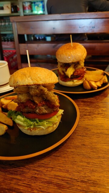 今日はレギュラーメニューで前から気になっていた、「ベイクドアップルバーガー」を頂きました。ラム酒で煮込んだ林檎とサワークリーム、粗挽きの胡桃が散らしてあって、黒胡椒がきいているバーガーです。