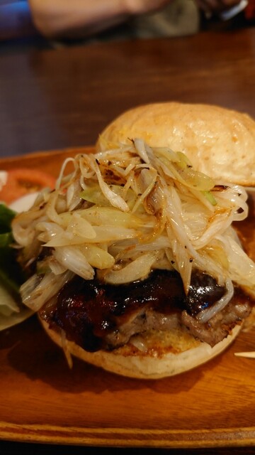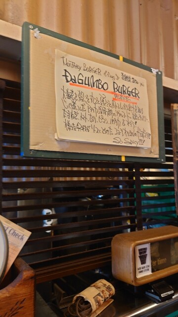 本日、カスタマイズを頂くために再訪です。この前食べたときに、レギュラーメニューの「彼女の極私的テリヤキバーガー」に入っている長葱ソテーを入れたらどうでしょうかとご主人に伺ったところ、有りでしょ〜とのお言葉を貰えたのでチャレンジです。