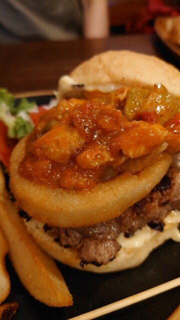 ご店主曰く、じっくり炒めたのち丸2日ゆっくり煮込むことで、玉葱の甘みを充分に引き出した、牛挽肉の旨味ディップ【チリ・コン・カン】を使ったハンバーガーです。そのスパイシーな味わいは、少し塩気のあるオランダ産ゴーダチーズとの相性、ソーマッチ。