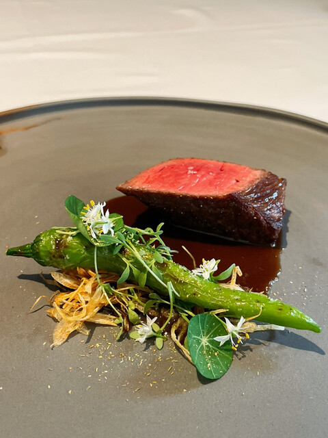 じっくり炭火でローストしミディアムレアに仕上がってます。アスパラやサマートリュフと一緒に。