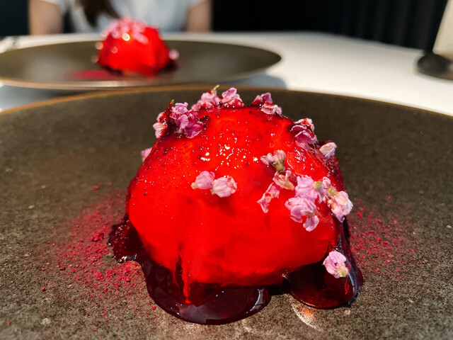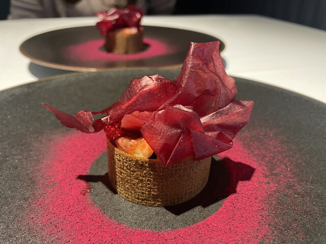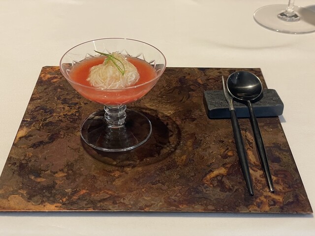 新生姜のブーケは中にイワシが詰まっており相性ばっちり。新生姜が爽やか〜。ブーケの細かさがすごいですがシェフが一つ一つ作ってるのかな…