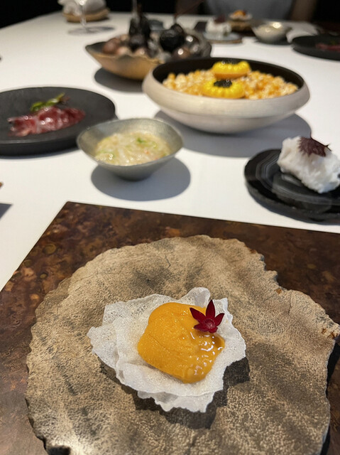 花弁のような貝の形の中身は今回はサザエ。前回は牡蠣でした。ウニは見たまま美味しい〜甘くてとろける。
