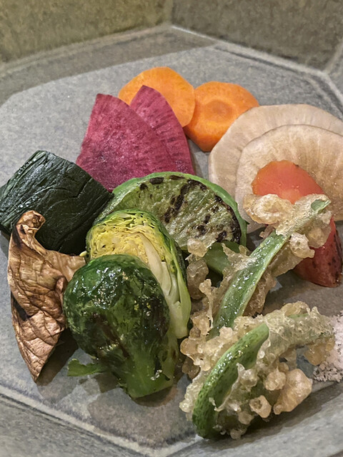 焼き野菜は付け合わせではなく一品として提供され、ワラビ、芽キャベツ、ヤーコンなどどれもとても新鮮で歯応えがよくとても美味しかったです。