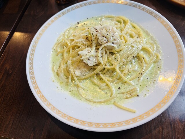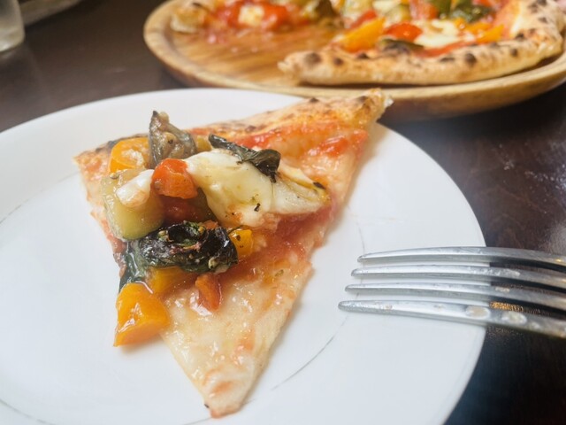 コロナ禍に戻ったような仕切りがありました。店内の雰囲気は家庭的な印象。シェフも店員さんも普段着というかラフな格好です。フラッと立ち寄り、さらりと食べる感じかな、と思いきや出された料理はめちゃくちゃ美味い。びっくりした。口コミ少ないし、なんで?って感じ。魅力的に映ったメニュー表からパスタのランチセットとピザを単品注文。サラダと共に出されたデミカップに注がれた冷製ビシソワーズ、濃い!口当たり滑らか。夏野菜の菜園風ピザはパプリカの香りがビンビンにしています。モッツァレラチーズのモチモチも生地のカリサクも手と口が止まらない。ヤリイカのジェノベーゼパスタ、香りが堪りません。強いていうならもう少し麺は柔らかい方が好き。ちょっと芯が残りすぎのような気がしました。だとしてもまた頼みたい逸品。もう一皿は帆立とバジルのクリームパスタ。こちらもバジルの香りとクリームが相まってまろやか。でも、せっかくならどちらかはトマトソースとかにしたら良かったとも思いましたが、どちらも美味すぎてこれはこれで正解と食べながら言い聞かせました。ジェノベーゼのオイルはバケットに付けて一滴残さず掬いたかった。もうこの時点で結構腹パン。バームクーヘンは相方曰く普通、らしい。添えられている生クリームと最後に口の中がさっぱりとするグレープフルーツの酸味がとても良かったです。