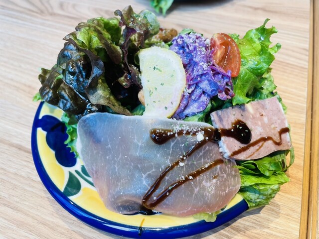 2000円のコースを頼みました。パスタが2種から選べます。2人でそれぞれ、明太クリームパスタとミートソースを注文。サラダにはキッシュや生ハム、燻製ハム?も乗っていて見た目のボリュームは男性も喜ぶサイズ。女性はもう少し葉物は小さく切って欲しい様です。かさ増しのために大きくカットしてるんでしょうけど。わら焼き焼きたてのカツオをガーリックチップ、塩、アリオリソース、ニンニクスライスなどお好みで合わせて。どれに合わせてもうまい。パスタも良い。値段相応。全体的に見た目から女性に人気がありそう。周りはほぼ女性客でした。ごちそうさまでした。