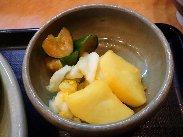 恐るべしやまと豚。お勧めは中以上。肉質、脂身の甘さとサラリとした口当たり!揚げ油も素材を損ねることなく良質なものを使っているように感じます。サクサクのパン粉に包まれたやまと豚…( ゚Д゚)ウっウマいよぉ…!!箸を持つ手が震えました。とんかつのあとに白米を一口…米の粒感と甘さ、適度な硬さと粘度…あっっ…( ゚Д゚)おっ…お替り…お願いします。気づいたらお茶碗が空になってました。付け合わせの漬物も完璧…漬かり過ぎず…野菜ひとつひとつの素材感があります。そして豚汁…( ゚Д゚))))お椀を持つ手が震えてこぼしそうになりました。人参、大根、牛蒡…ひとつひとつにきちんとした味わいがあり、美味しいです。テーブルの七味は香りが抜群。山椒、陳皮、唐辛子…豚汁のうまさを引き立てます。油が薄っすらと浮いてますが、全くくどくありません。付け合わせのキャベツ…これはいわゆる千切りキャベツ…「このキャベツを食べるならこの切り方です。」という主張を感じました。手作りドレッシングは「にんじん」と「シークヮーサー」があります。どちらもおススメです。生産から配食までの様々な手間暇、生産者から料理人までの研究心…自然の恵み…こんなに美味しいとんかつを食べれることに感謝します。ご馳走様でした。食後のお茶を飲みながら目頭が熱くなりました( ノД`)シクシク…お茶の柔らかな甘味も素晴らしかったです。伊右衛門さんも驚くかと思います。