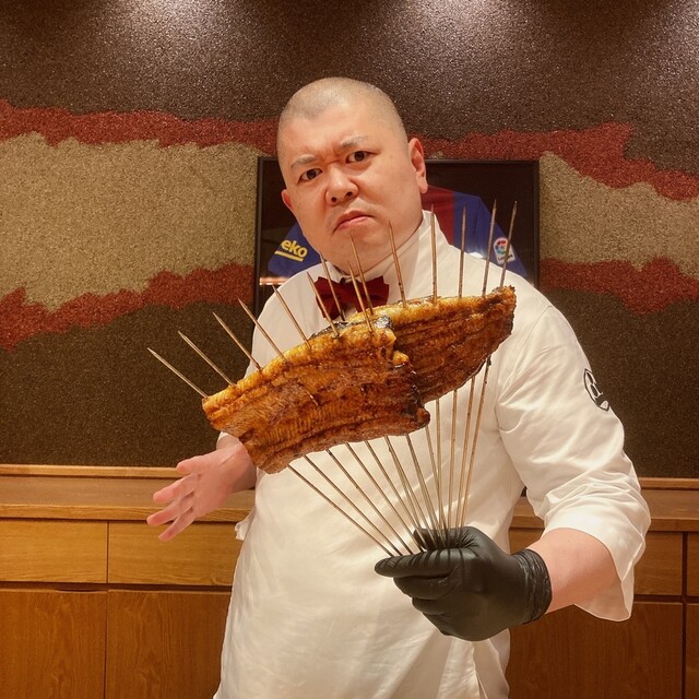 まずは串刺しにしたウナギと共にポーズを取ってくれた後、ウナギドッグが提供された。