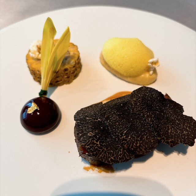 メインは黒毛和牛フィレのステーキにトリュフを贅沢に載せたもの。フィレ肉はしっとりと柔らかく旨味たっぷり。えげつねえほどトリュフの香りを感じられて素晴らしい。